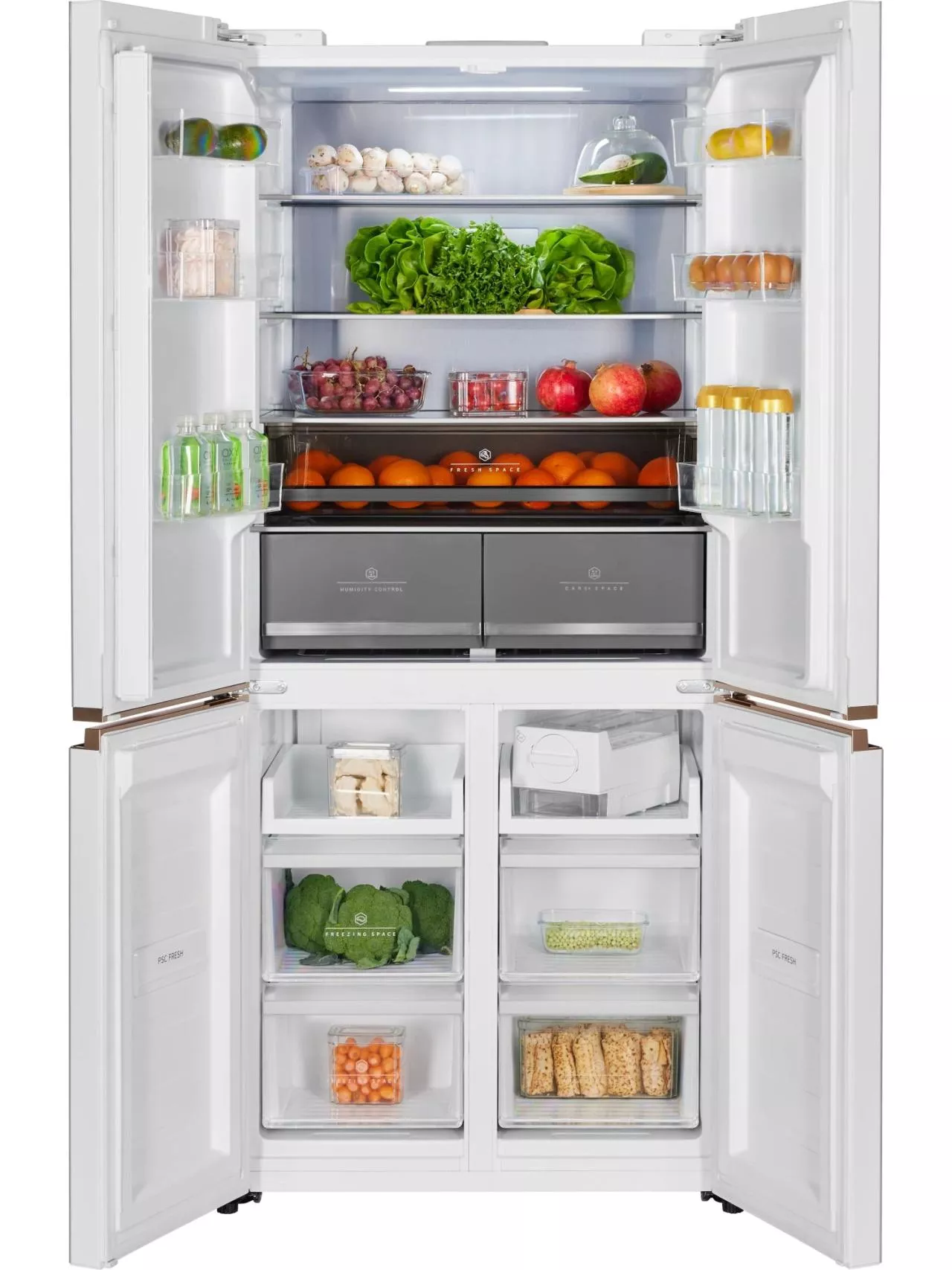 Ящик CARE+SPACE с индивидуальной зоной охлаждения предназначен для хранения продуктов в нескольких режимах: «морепродукты» при температуре -1,5°С, «мясо» с показателем 2°С и «детское питание, фрукты» с температурой 4°С. Установленная в ящике мембрана поддерживает нужный для каждого из режимов уровень влажности. Выдвижное отделение для овощей и фруктов также оборудовано мембраной для удержания влаги внутри зоны, при этом не препятствует движению воздуха. Выдвижные крышки обоих ящиков обеспечивают дополнительную герметичность емкостей.