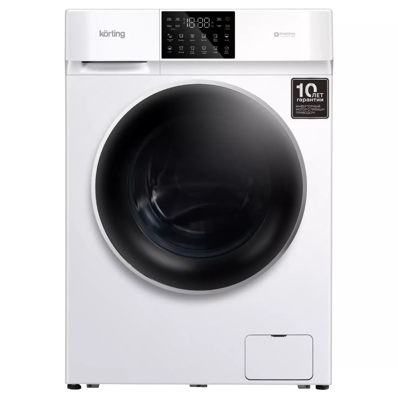 Инверторный мотор с прямым приводом работает тише и экономичнее (класс A+++), повышая ресурс устройства. Для комфорта предусмотрены отложенный старт до 24 часов и ночной режим, для безопасности — блокировка панели и автоматическая блокировка дверцы. Защитная крышка люка помогает избежать контакта с нагретым стеклом и держать люк в чистоте.