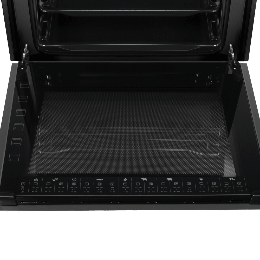Внутри — черная эмаль легкой очистки, которая облегчает уход после запекания. Оснащение продумано для ежедневного комфорта: яркая подсветка, электрический гриль, конвекция и два уровня телескопических направляющих, чтобы безопасно выдвигать противни без риска проливов.