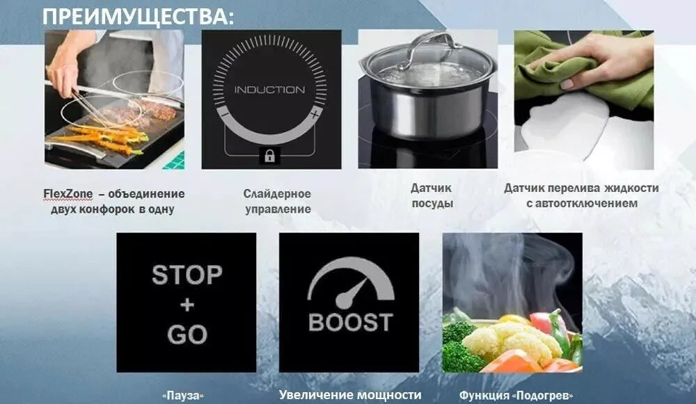 Функция Boost ускоряет нагрев и уменьшает время готовки. С мгновенным увеличением подачи мощности на одну конфорку можно за 5 минут вскипятить воду или молоко, приготовить блюда, требующие быстрой обжарки.