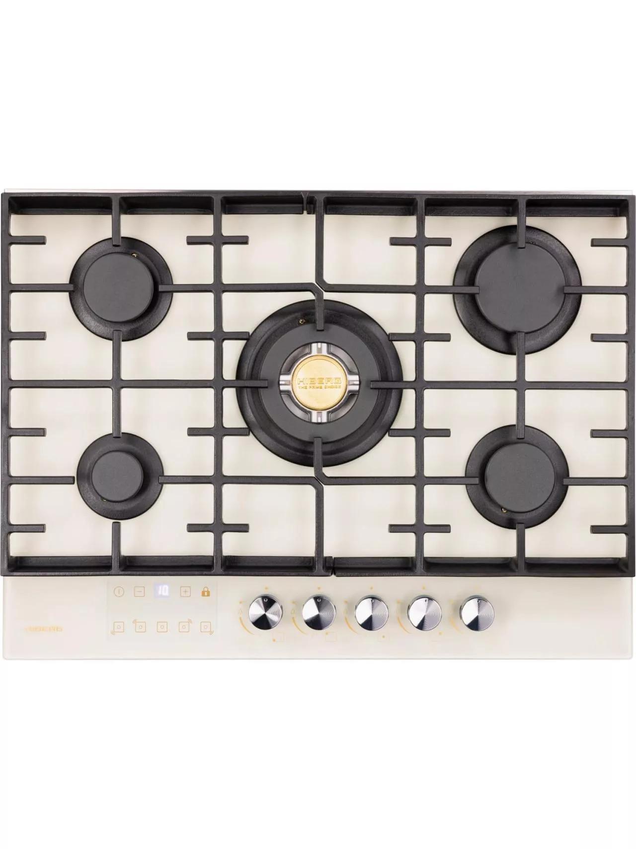Пять конфорок газовой варочной панели отличаются диаметром и мощностью. Дополнительная горелка позволяет готовить еще больше блюд одновременно. Самая большая конфорка – WOK с тройным рядом пламени и мощностью 3,4 кВт. Усиленный жар способен быстро нагреть толстостенную глубокую посуду с небольшим диаметром дна для приготовления азиатской кухни. Также на ней можно быстро вскипятить воду, ускорить процесс жарки мясных и рыбных блюд до хрустящей корочки при добавлении небольшого количества жира.